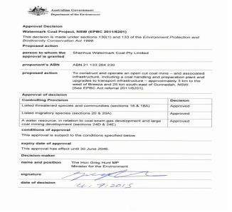 中國神華沃特馬克項目于 2015 年取得新州政府的《開發許可》和聯邦環境部的環評批復,獲得了澳洲礦業開發的核心審批。